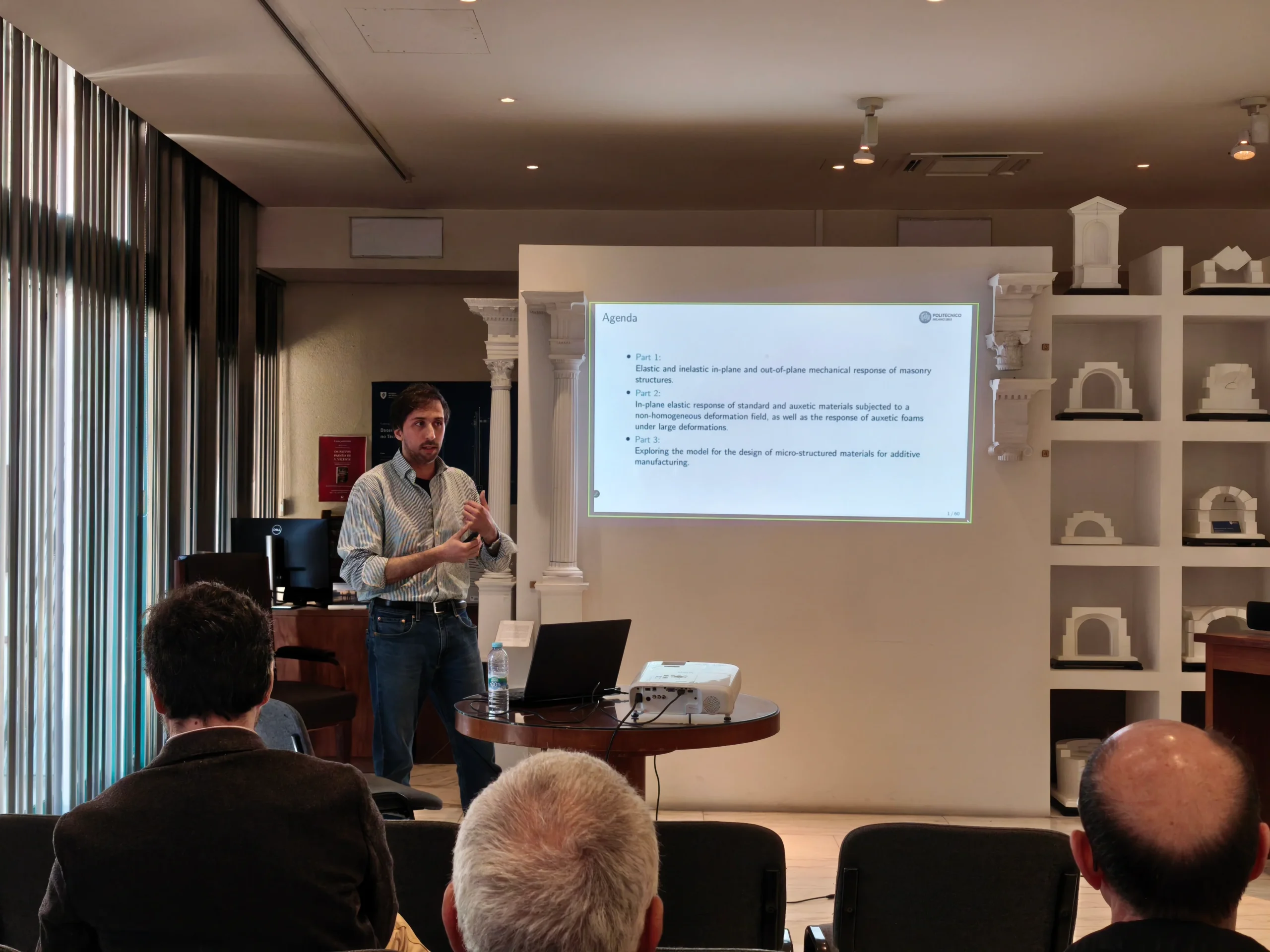 The session focused on advanced modelling strategies for the mechanical analysis of materials, highlighting the application of rigid-body–spring models (RBSM) across different scales. The presentation addressed their use in masonry structures and their extension to the design and analysis of architected materials, including auxetic systems.